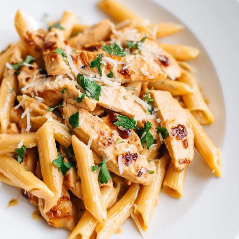 - Toss the cooked pasta and sliced chicken into the skillet, adding splashes of your reserved pasta water if the sauce seems too thick. Cook everything together for 1–2 minutes, tossing gently, until each piece of pasta is coated and everything is heated through. Serve immediately with cilantro sprinkled on top and extra Parmesan if you are feeling generous.