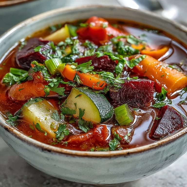 Save There's something quietly magical about watching a pot of clear broth transform into a rainbow of flavors and colors. My kitchen window faces east, and one morning while chopping vegetables for this soup, the sunrise caught the heap of diced beetroot in such a way that I stopped mid-slice to just stare at it. That's when I realized this wasn't just another soup recipe, it was an edible sunrise in a bowl.