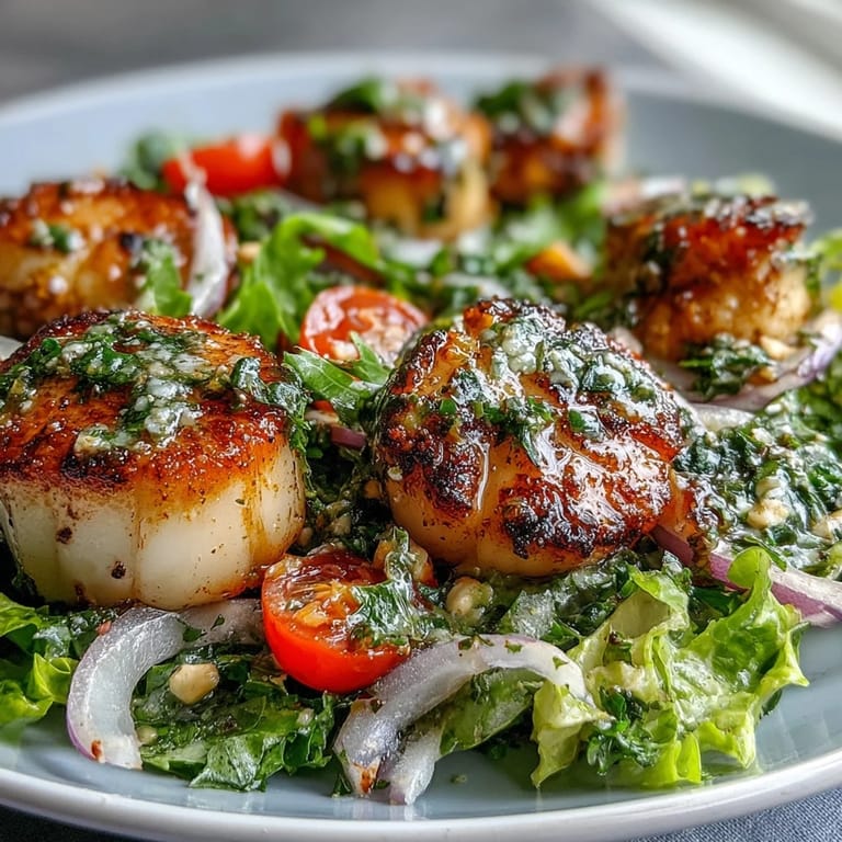 I made this for a small dinner party last spring when I wanted something lighter than the usual pasta or roast. My friend Sarah, who claims she doesnt like salad as a main, went back for seconds and asked for the vinaigrette recipe. The scallops were gone in minutes, and I learned that night that simple done right beats complicated every time. There was something about the way the pesto clung to the greens and pooled around the scallops that made everyone slow down and savor it. It became my signature warm weather dish after that.